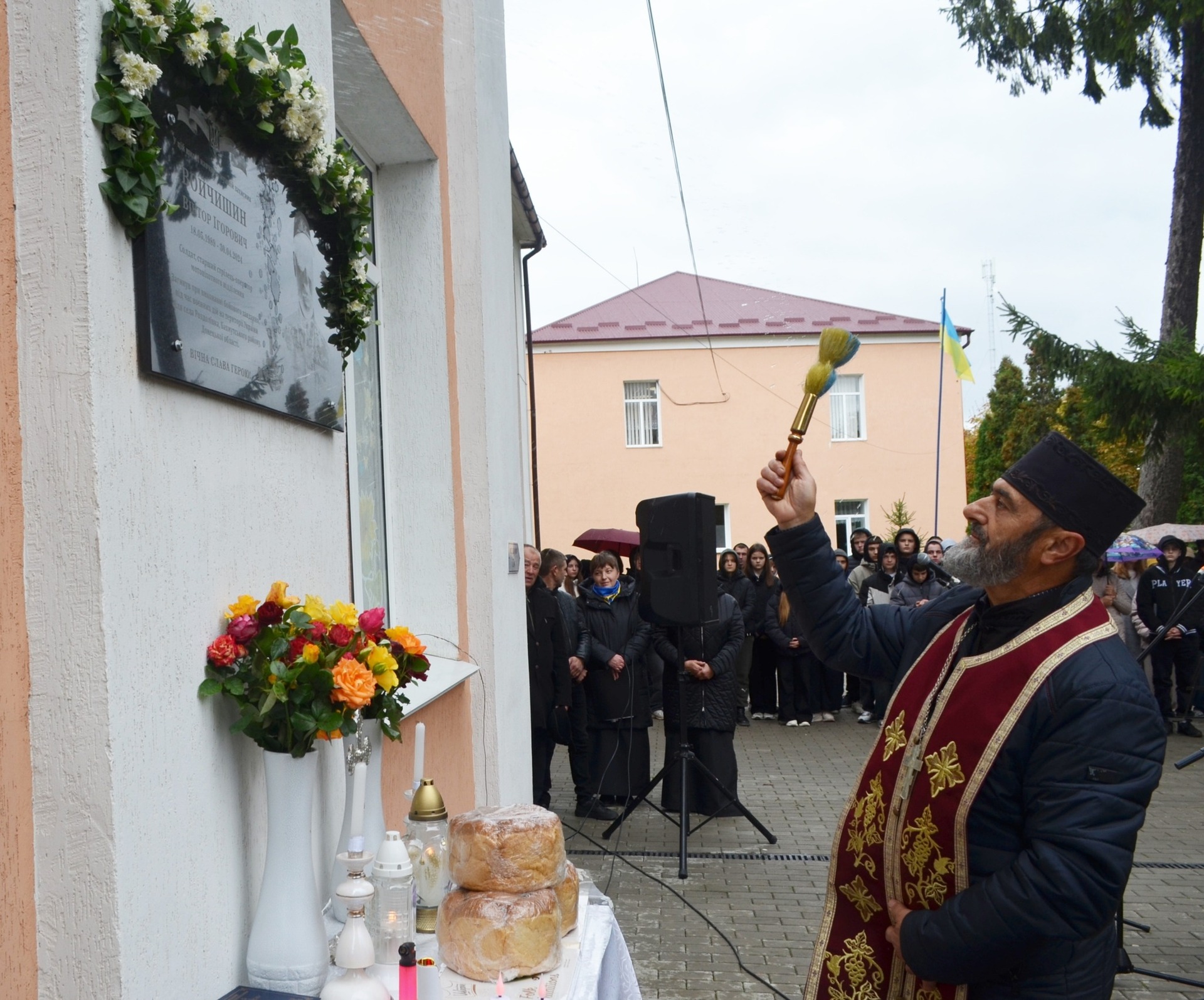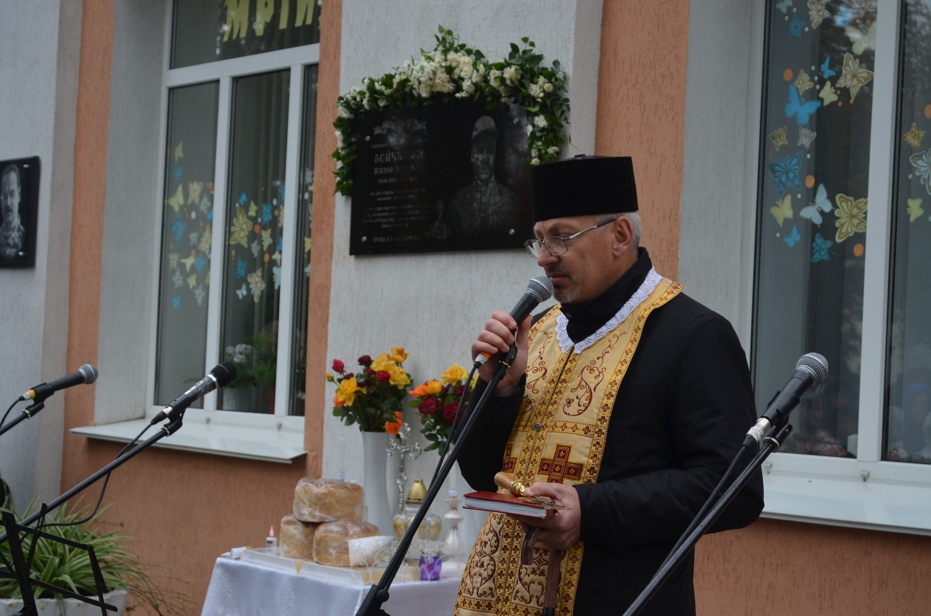 Священники провели поминальний молебень та освячення пам’ятного знаку. Почесне право відкрити дошку було надане близьким родичам загиблого Героя – матері та сестрам.