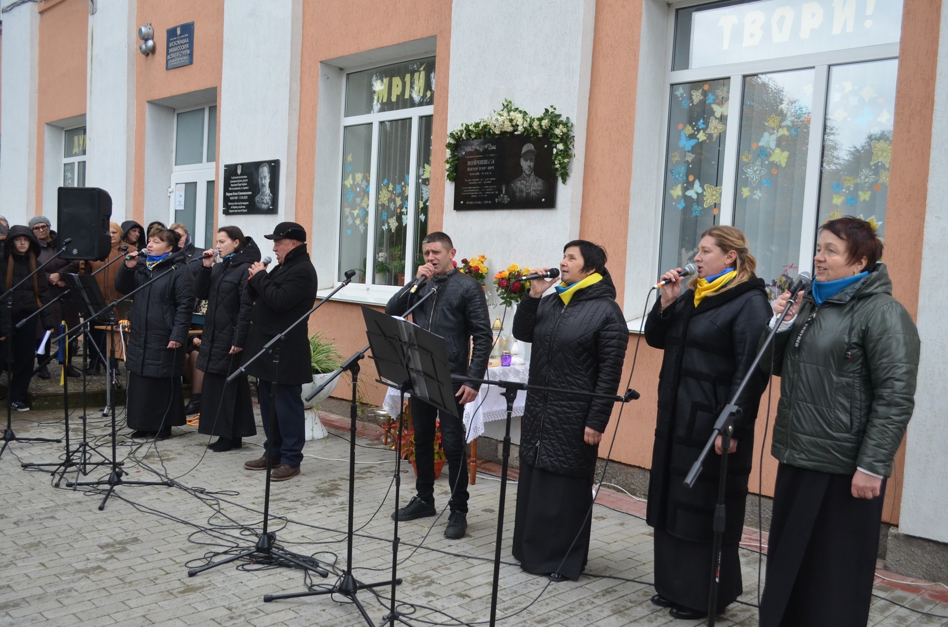 На урочистості з нагоди встановлення пам’ятного знаку зійшлися родичі Героя, друзі, голова громади разом із педагогічним колективом, учнями та ученицями школи, а також жителі села і громади.