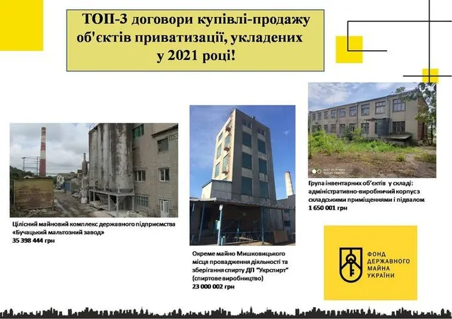 ТОП-3 договори купівлі-продажу об'єктів приватизації, укладених у 2021 році: одноосібний лідер – це договір купівлі-продажу Цілісного майнового комплексу державного підприємства «Бучацький мальтозний завод». Завдяки залученню інвестора на підприємство держава отримала 35 398 444 грн; 2 місце – договір купівлі-продажу окремого майна Мишковицького місця провадження діяльності та зберігання спирту ДП «Укрспирт», від приватизації якого до державного бюджету надійшло 23 000 002 грн. На третьому – окреме майно група інвентарних об’єктів у складі: адміністративно-виробничий корпус з складськими приміщеннями і підвалом, загальною площею 1133,1 м² – від продажу якого забезпечено надходження коштів до бюджету в сумі 1650 001 грн.