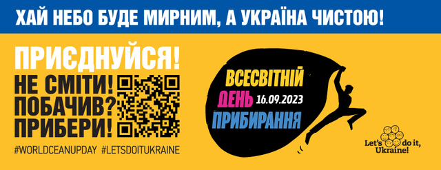 16 вересня 2023 року під гаслом «Хай небо буде мирним, а Україна чистою!» у 24 регіонах з дотриманням обмежень воєнного часу, враховуючи норми безпеки та географічні особливості регіонів, Україна традиційно приєднається до Всесвітнього дня прибирання «World Cleanup Day» разом з 70 мільйонами учасників у 191 країні Світу.