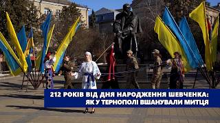 Літературно-музична імпреза з нагоди 212-ї річниці від Дня народження поета, художника, прозаїка Тараса Шевченка відбулася 9 березня. Десятки людей принесли квіти до пам’ятника Великому Кобзарю та вшанували його пам'ять спільною молитвою. Також представили театральну постановку у виконанні народного аматорського драматичного театру “Сузір’я”, процитували вірші. Академічний камерний хор Тернопільської обласної філармонії “Бревіс” виконав пісні на слова Тараса Шевченка.