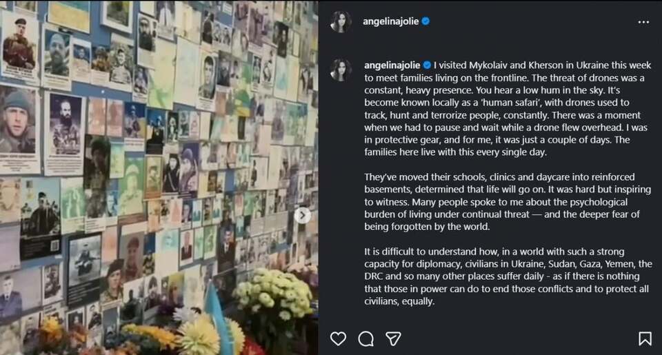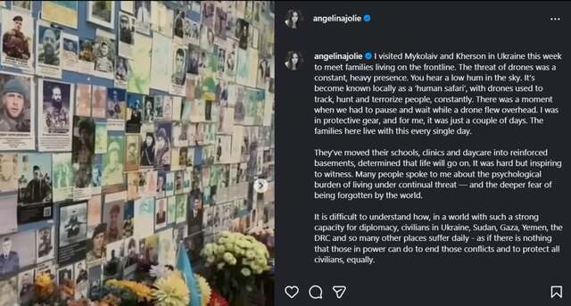 Цього тижня відвідала Миколаїв та Херсон в Україні, щоб зустрітися з родинами, які живуть на передовій. Загроза дронами була постійна, важко бути там. Чуєш гудіння в небі. Тут це вже називають «сафарі на людей» - дрони використовують, аби стежити, переслідувати й тероризувати місцевих мешканців без упину. Був момент, коли нам довелося зупинитися й перечекати, поки дрон пролетить над головою. Я була в захисному спорядженні, і для мене це тривало лише кілька днів. А сім'ї тут живуть із цим щодня. Вони перенесли школи, клініки та дитячі садки до укріплених підвалів, і налаштовані продовжувати життя попри все. Це було важко бачити, але водночас це неймовірно надихає. Багато хто говорив зі мною про психологічний тягар постійної небезпеки - і про ще глибший страх бути забутими світом, - написала Анжеліна та показала декілька фото з України.