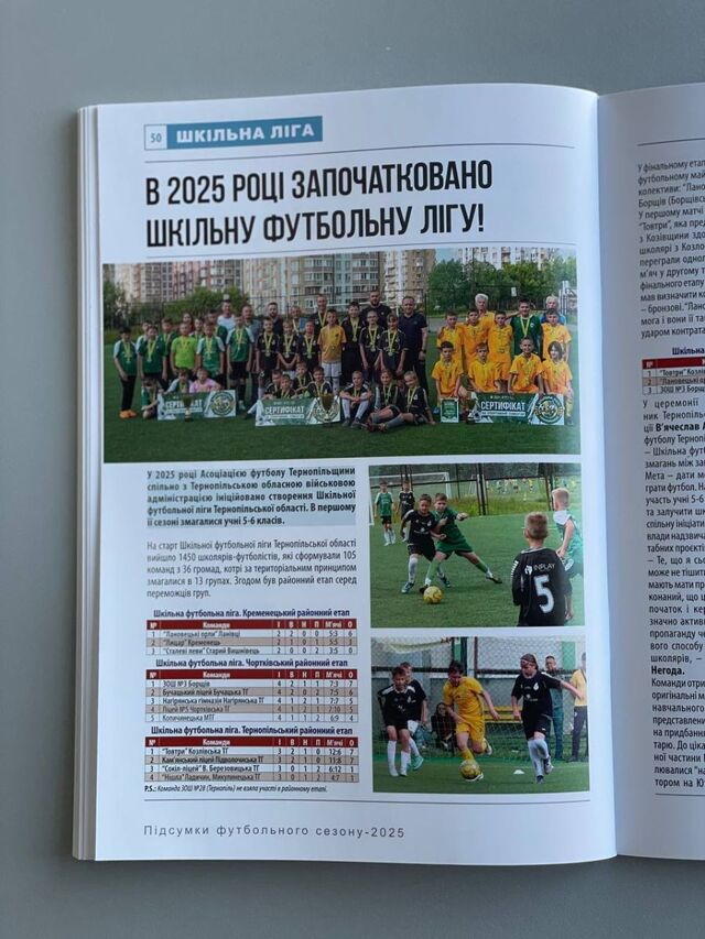 Значний розділ книги присвячено дитячо-юнацькому футболу. У ньому підбито підсумки обласної дитячо-юнацької футбольної ліги та дівочих змагань сезону 2024/25, а також висвітлено перебіг першого кола сезону 2025/26. Окремо представлено новий проєкт — «Шкільну футбольну лігу», організовану спільно Асоціацією футболу Тернопільщини та Тернопільською обласною військовою адміністрацією.