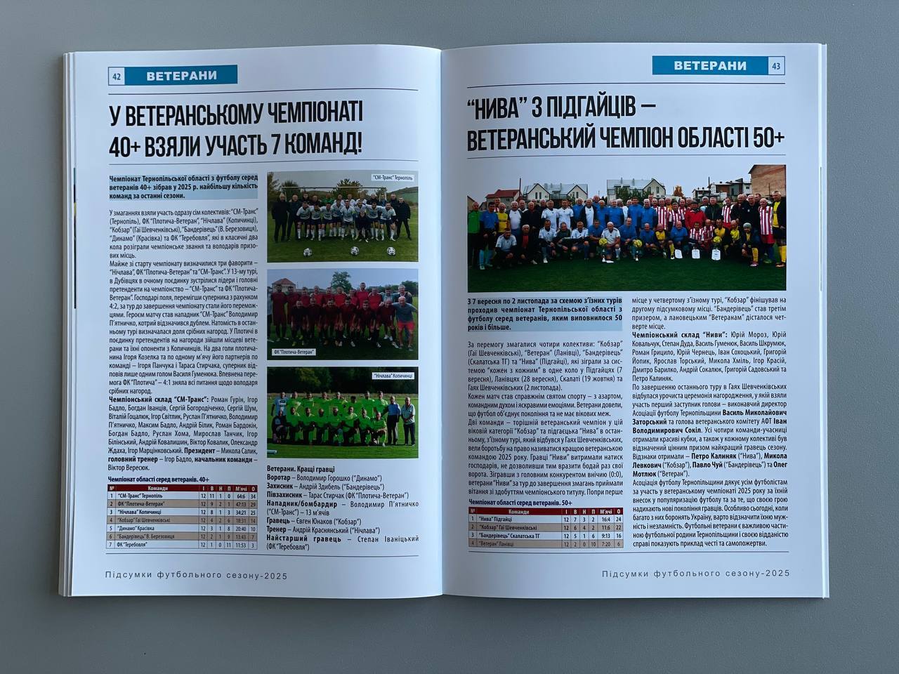 Довідник детально висвітлює ветеранський футбол: чемпіонат області у вікових категоріях 40+ та 50+, чемпіонат з футзалу серед ветеранів (у семи вікових категоріях). Також у книзі підсумовано змагання Ліги чемпіонів, переможцем якої став ФК «Плотича», Ліги Тернопільщини (ФК «Біла») та Суперкубка районів Тернопільської області, який виборов ФК «Куропатники».