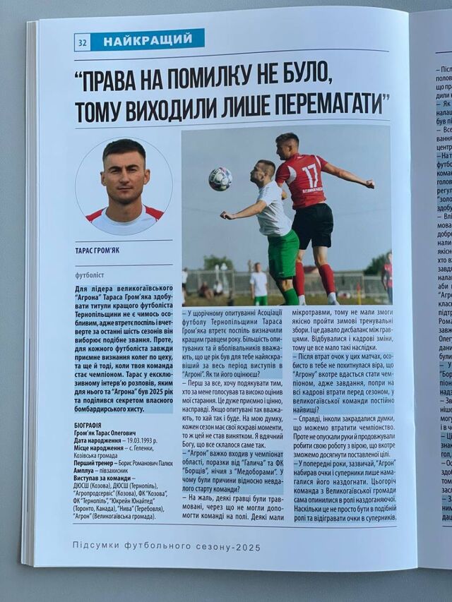 Окрему увагу приділено інтерв’ю з кращим гравцем 2025 року за результатами опитування тренерів і капітанів команд. Ним став Тарас Гром’як («Агрон», Великогаївська громада). У довіднику також оприлюднено результати голосування.