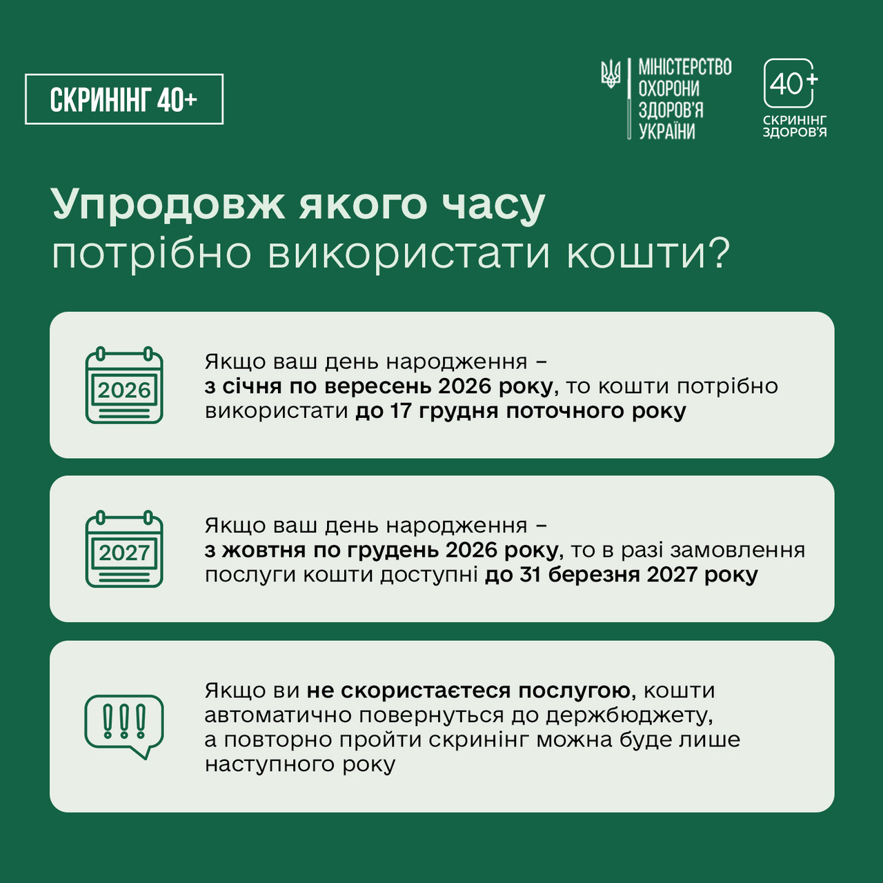 Детальну інформацію про програму Скринінг здоров’я 40+ та відповіді на найпоширеніші запитання знайдете за посиланням. Там же буде доступний і перелік медичних закладів-учасників.