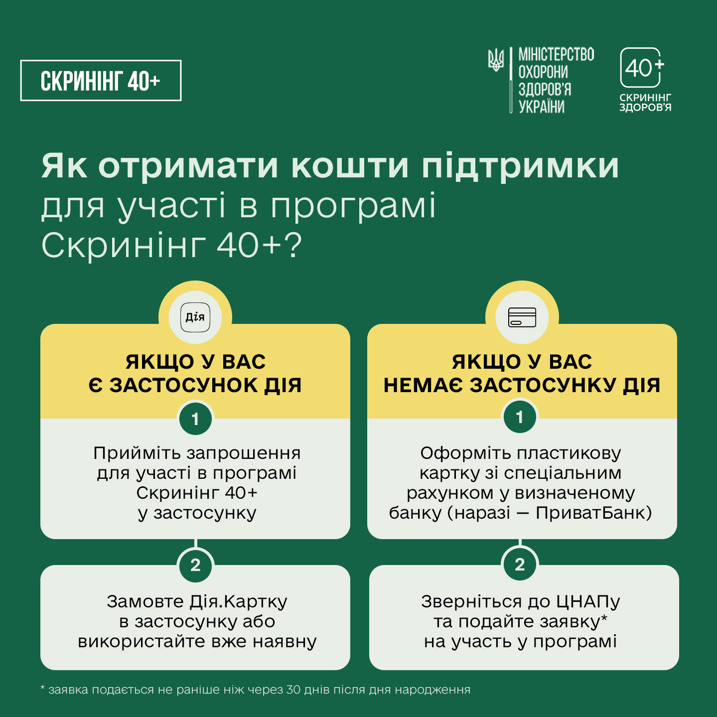 - Для тих, хто не користується застосунком Дія, передбачена можливість оформлення банківської картки та подання заявки через ЦНАП. Це можна зробити через 30 днів після дня народження.