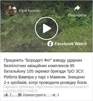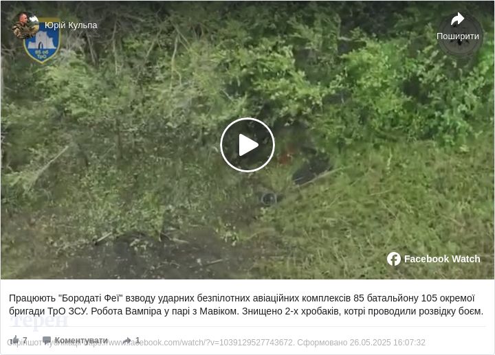 Працюють «Бородаті Феї» взводу ударних безпілотних авіаційних комплексів 85-го батальйону 105-ї окремої бригади ТрО ЗСУ. Робота «Вампіра» у парі з «Мавіком». Знищено 2-х ворогів, котрі проводили розвідку боєм, — йдеться в повідомленні 105-ї бригади.