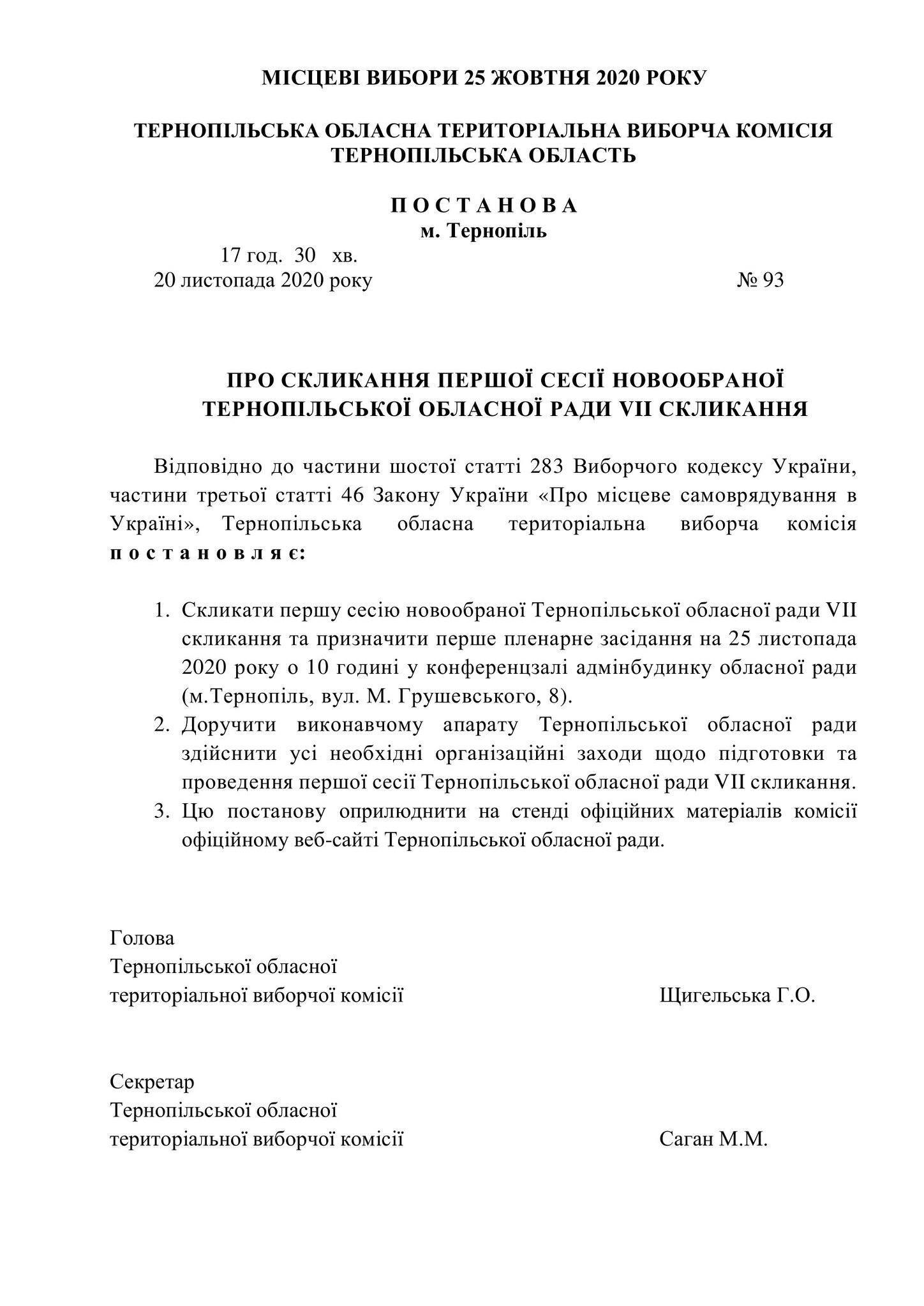 Нагадаємо, першу сесію Тернопільської обласної ради 7-го скликання призначили на середу, 25 листопада. Новообраних депутатів чекатимуть о 10.00 у конференцзалі на вул. Грушевського, 8. У засіданні повинні взяти участь представники 6-ти партій: «Європейська Солідарність», «Свобода», «За майбутнє», «Слуга народу», «Батьківщина» і «Довіра».