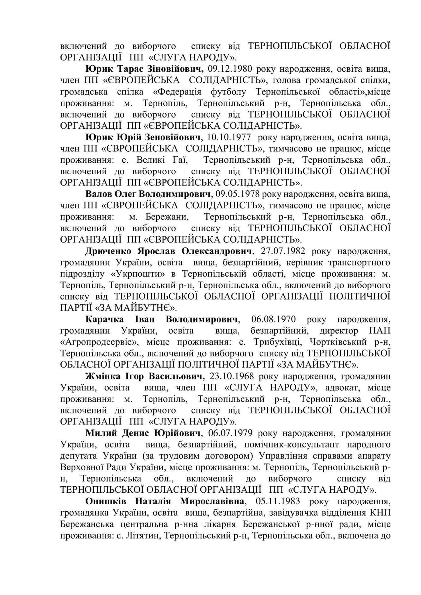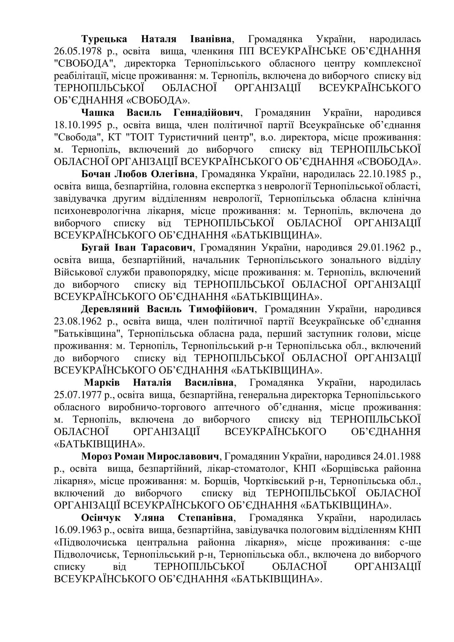 Ще 16 листопада у ТВК затвердили список із 18-ти майбутніх депутатів. Там є двоє братів Юриків – Юрій і Тарас, дружина колишнього секретаря Тернопільської міської ради Віктора Шумади – Ірина, голова Тернопільської ОДА Володимир Труш і заслужений артист Володимир Вермінський.