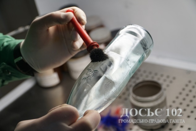 - Для виявлення слідів папілярних узорів на пляшках застосовуємо магнітний дактилоскопічний порошок, а на папері чи картоні використовуємо розчин нінгідрину в ацетоні, - розповідає головний судовий експерт сектору дактилоскопічних досліджень Віктор Ратнюк.