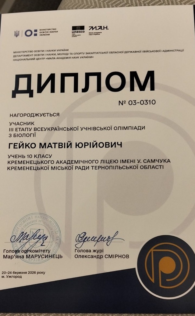 Учень 10 класу Кременецького академічного ліцею імені Уласа Самчука Матвій Гейко представляв Тернопільську область на фінальному етапі Всеукраїнської учнівської олімпіади з біології, що відбувалася в Ужгороді. Про це повідомили у пресслужбі ліцею.