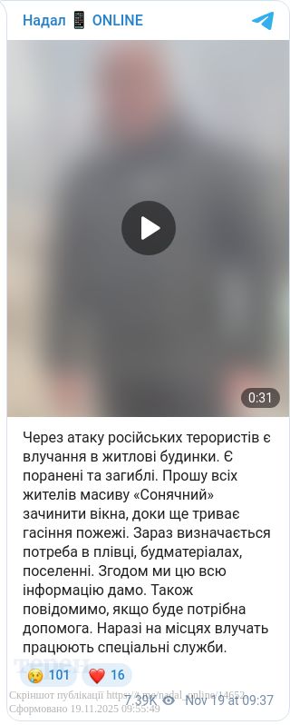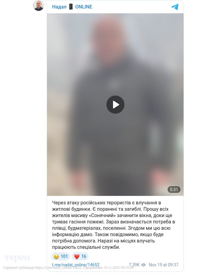 Через атаку російських терористів є влучання в житлові будинки. Є поранені та загиблі. Прошу всіх жителів масиву «Сонячний» зачинити вікна, доки ще триває гасіння пожежі. Зараз визначається потреба в плівці, будматеріалах, поселенні. Згодом ми цю всю інформацію дамо. Також повідомимо, якщо буде потрібна допомога. Наразі на місцях влучань працюють спеціальні служби, - повідомив мер Тернополя Сергій Надал.