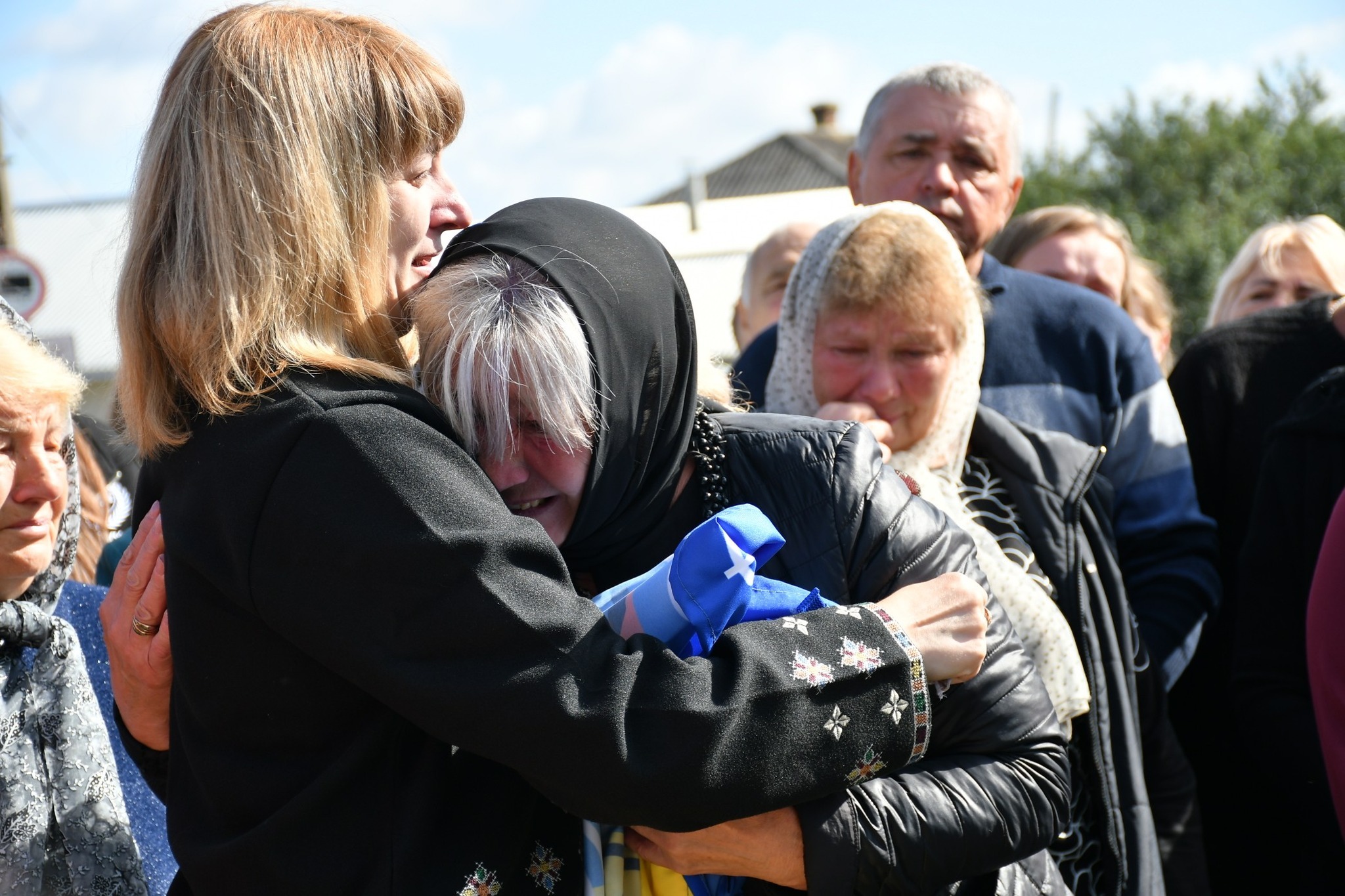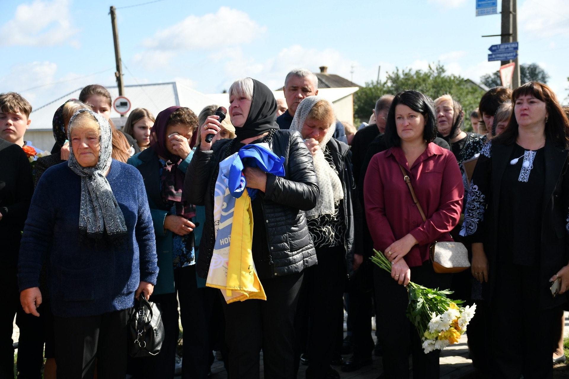Під час відкриття пам’ятного стенду своєму брату жінка розгорнула прапор, переданий командуванням 5-ї окремої штурмової Київської бригади на знак подяки за службу і жертовність спеціально до Дня пам’яті воїна.