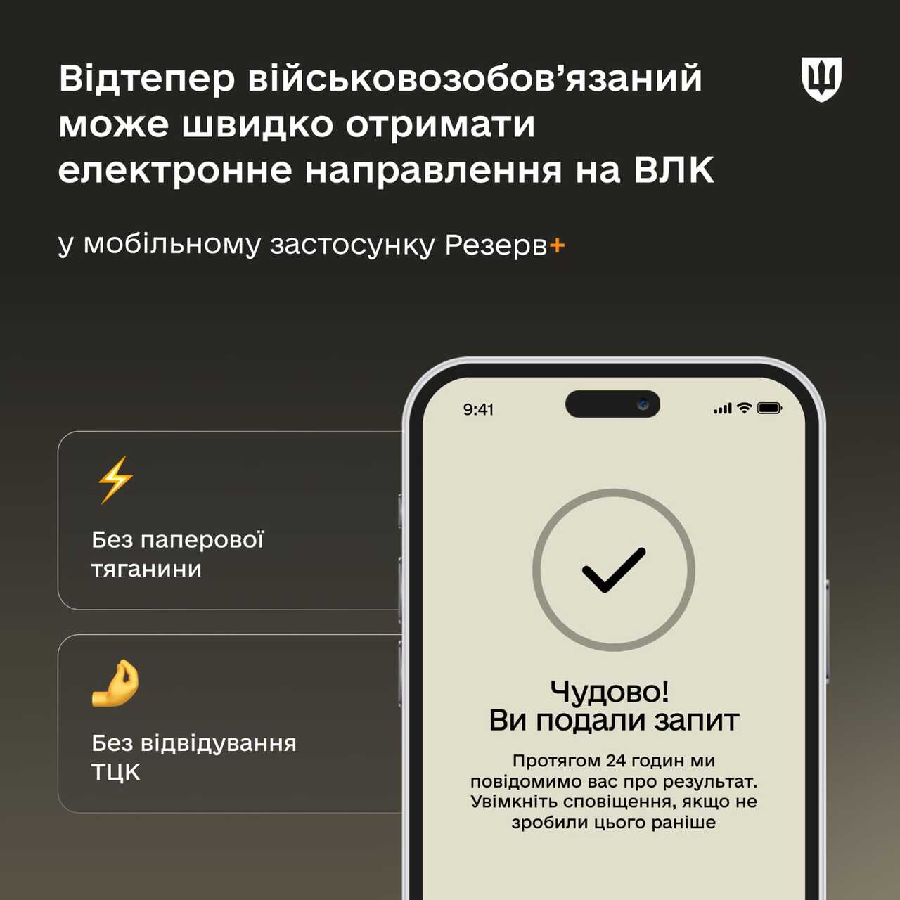 Тепер людина, яка бажає пройти огляд на придатність до військової служби, може отримати направлення на ВЛК онлайн. Для цього достатньо авторизуватись у застосунку Резерв+ та подати запит у кілька кліків.