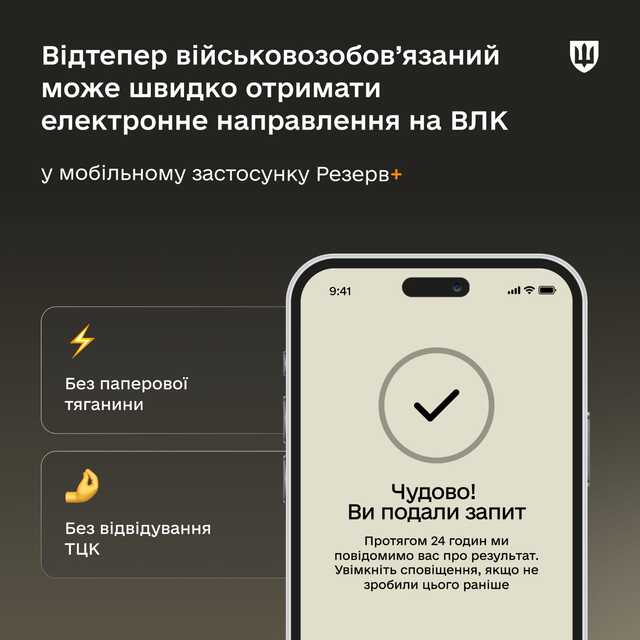 Саме так. Подавши запит у Резерв+, протягом доби людина отримує сповіщення, в якому містяться всі потрібні деталі: номер та дата реєстрації направлення, адреса закладу охорони здоров’я для проходження ВЛК, керівник якого ТЦК підписав направлення. Цього сповіщення достатньо, щоб спланувати огляд.