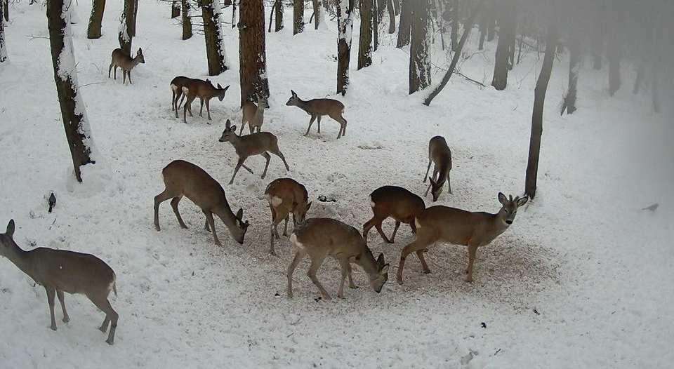 Єгері частіше, ніж в інші пори року, наповнюють годівниці та залишають корм для тварин. Козулі, яких зафіксувала фотокамера вдень та ввечері, їли кукурудзу.