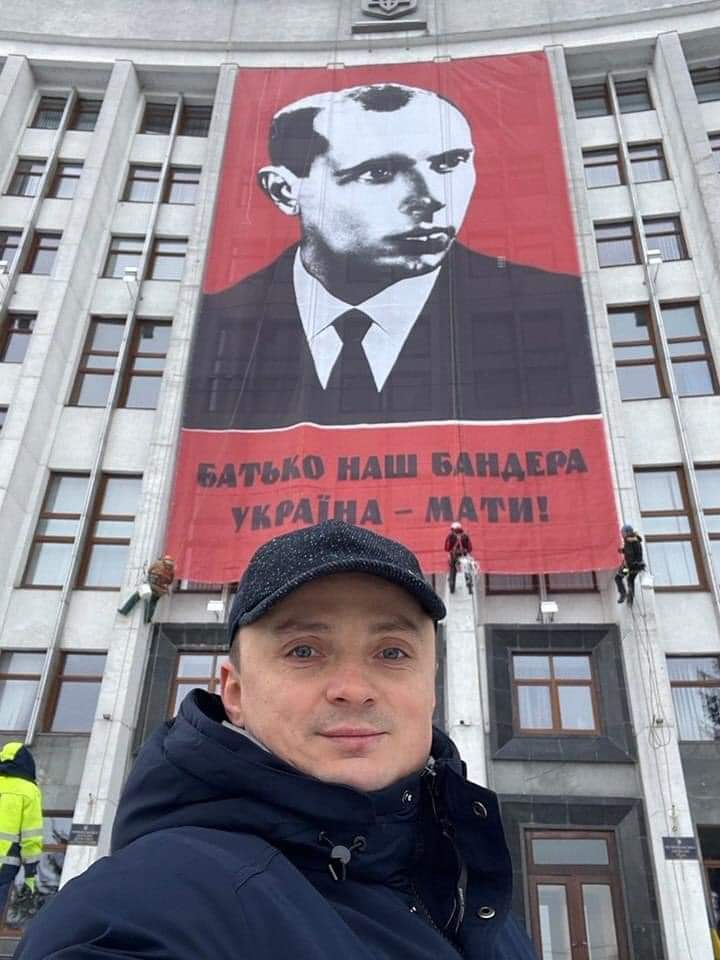 Адміністративну будівлю Тернопільської обласної ради та облдержадміністрації прикрасили новим банером із зображенням Степана Бандери.
