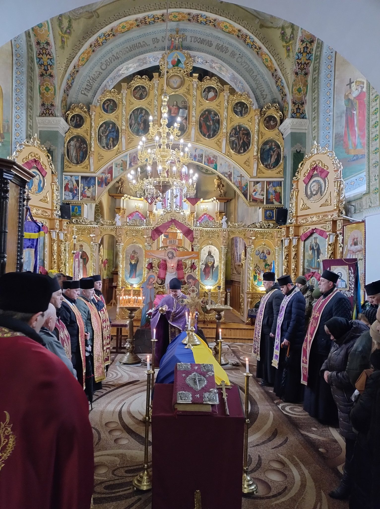 Спочатку прощання відбулося на подвір’ї рідного дому воїна, де рідні, близькі, сусіди та всі присутні спільно помолилися за упокій його душі. Після цього жалобний кортеж вирушив до Церкви Успіння Пресвятої Богородиці, де продовжили заупокійну молитву та провели богослужіння.