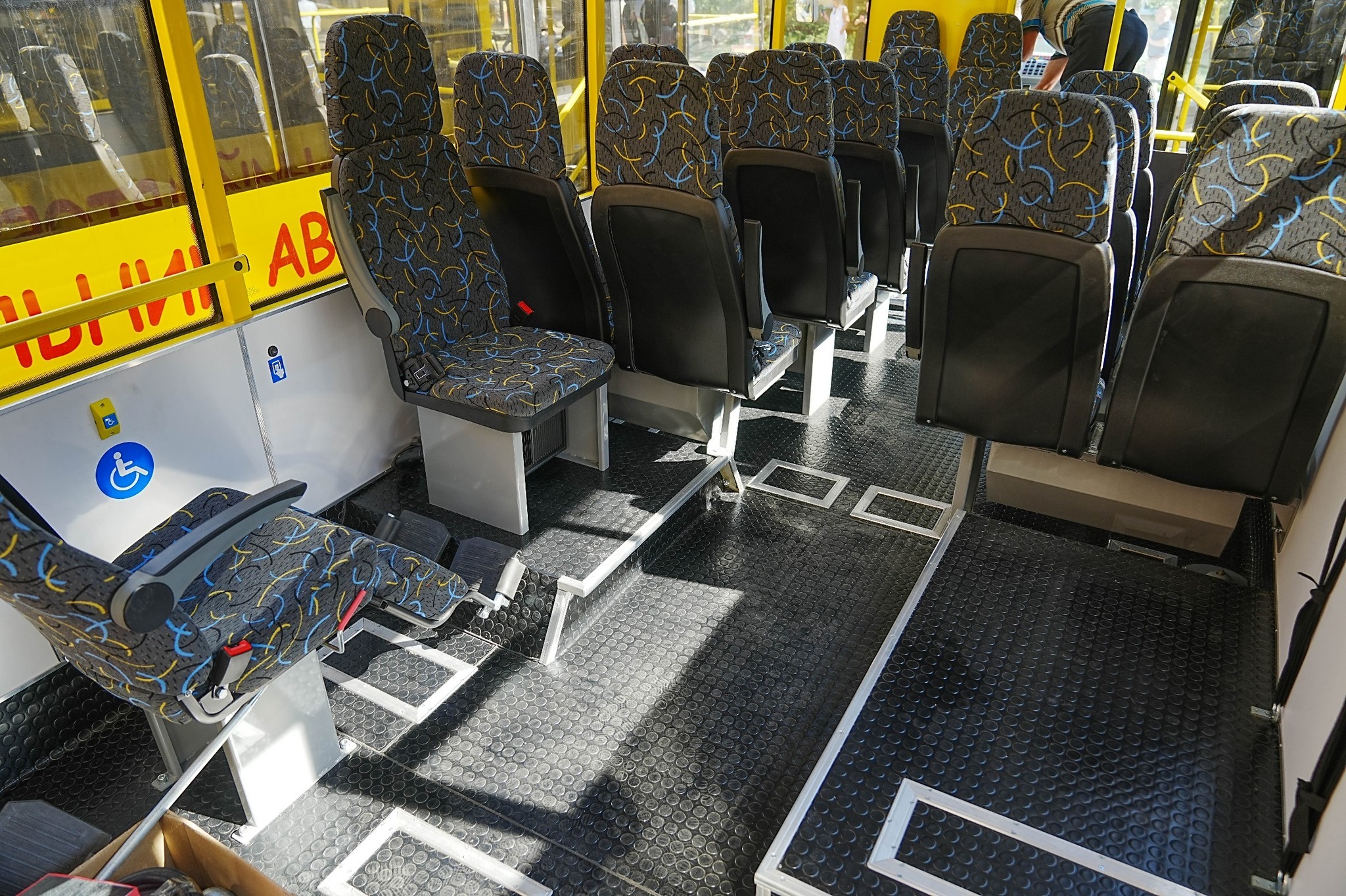 «Школярики» спеціально обладнані для перевезення маломобільних груп населення, мають місця для супроводжуючих та для крісел колісних.