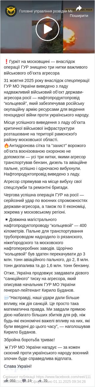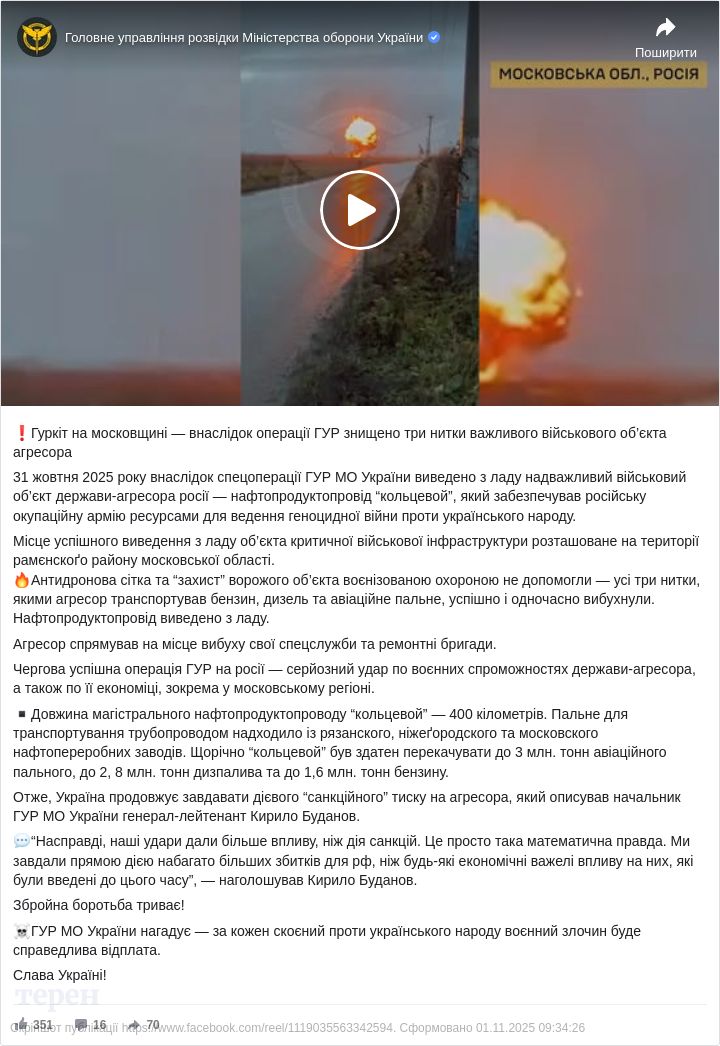31 жовтня 2025 року внаслідок спецоперації Головного управління розвідки Міністерства оборони України виведено з ладу стратегічний нафтопродуктопровід «Кольцевой» у московській області. Об’єкт забезпечував російську армію пальним для ведення війни проти України. Про це повідомили у пресслужбі ГУР МО.