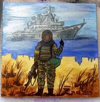 Ірина Горошко малює незламний Бахмут, «російський корабель», військових, українські краєвиди та символіку. Частину коштів, виручених з продажу одягу і картин, художниця передає ЗСУ