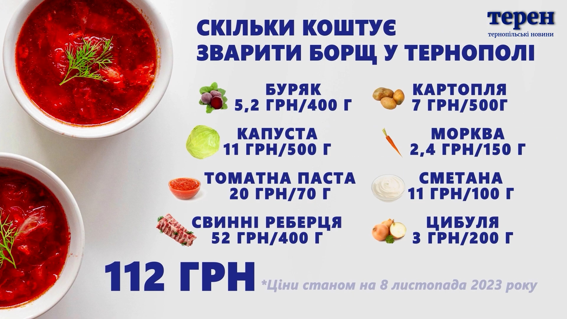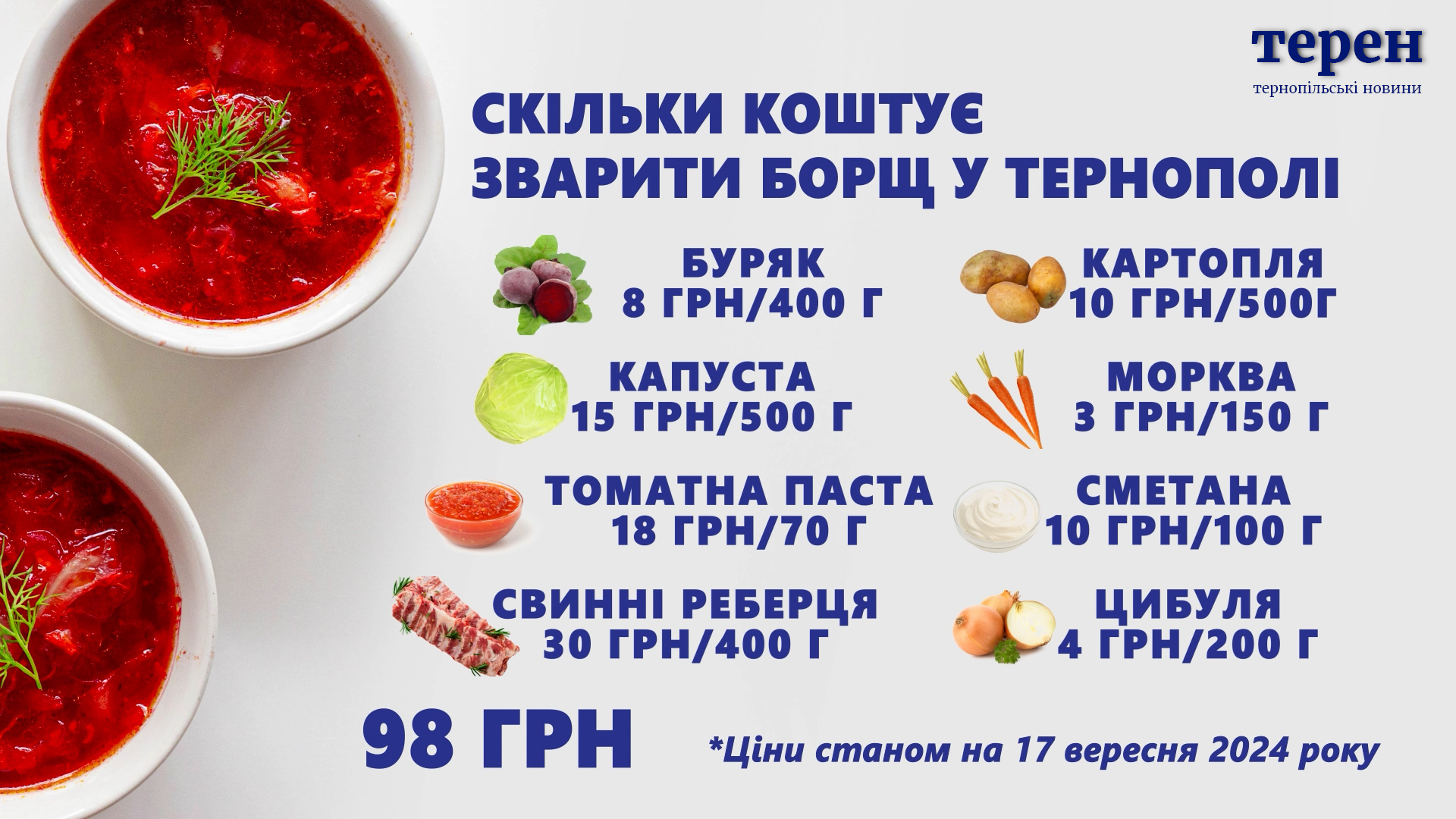 Отже, згідно з підрахунками журналістів Терену, цього року приготувати каструлю борщу у Тернополі коштує щонайменше 92 гривні, тоді як у вересні минулого року це вартувало 98 гривень. А у листопаді 2023 року – 112 гривень.