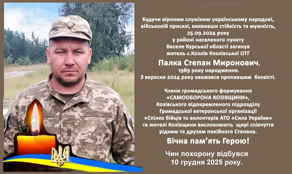 Також 10 грудня жителі Козлівської громади провели в останню дорогу загиблого Героя Степана Палку