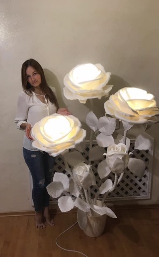 — Для першої квітки я використовувала зразок, виготовляла її слідуючи вказівкам, робила точні заміри. Тепер мені не потрібно робити розрахунків — знаю, яким має бути готовий виріб, і все роблю на око, — усміхається майстриня. — Зазвичай квітка фіксується на основі, нею може бути й декоративний горщик, для стебла використовую гнучкі трубки, аби надати квітці “живої” форми, найчастіше замовляють виріб із підсвіткою, тож всередину монтуємо проводи (у роботі мені допомагає чоловік), відтак — лампочки й потім приступаю до виготовлення квітки. Найбільше матеріалів потрібно для троянди, проте незабаром візьмусь за піони й для них треба буде ще більше матеріалів. Якщо троянда складається з близько трьох десятків пелюсток, то піон — із шістдесяти. Для того, аби виріб мав привабливий вигляд, розміри пелюсток мають бути різними. Звісно, чим більша квітка, тим більше часу потрібно на її виготовлення. Проте з малими виробами працювати складніше, адже потрібно проробити безліч дрібних деталей, зробити все акуратно.