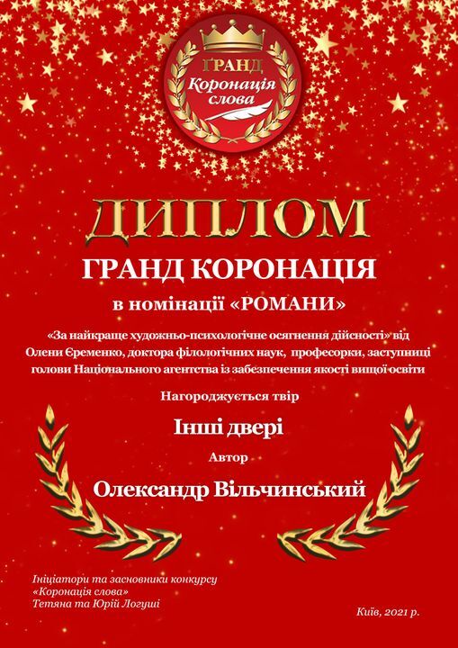 - Колись я вже отримував відзнаку від «Коронації слова» за «Суто літературне вбивство», потім Гран-прі і першу премію за «Останнього героя». А тепер от «Гранд Коронація» відзначила мій новий роман «Інші двері». Що ж, може, для декого це стане додатковим стимулом придбати і прочитати книжку. Адже для автора це найважливіше. Ну, а відзнаки — це завжди приємно. Впевнений, що роман «Інші двері» знайде свого читача, вже знаходить. Принаймні, я старався щоб історія вийшла цікавою.