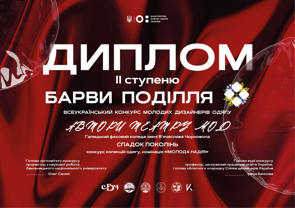 Студентський театр мод Галицького фахового коледжу імені В’ячеслава Чорновола вкотре гідно представив Тернопіль на всеукраїнському рівні. Колекція «Спадок поколінь» здобула друге місце в номінації «Молода надія» Всеукраїнського конкурсу молодих дизайнерів одягу «Барви Поділля-2025», що відбувся у Хмельницькому. Про це повідомили у міській раді.