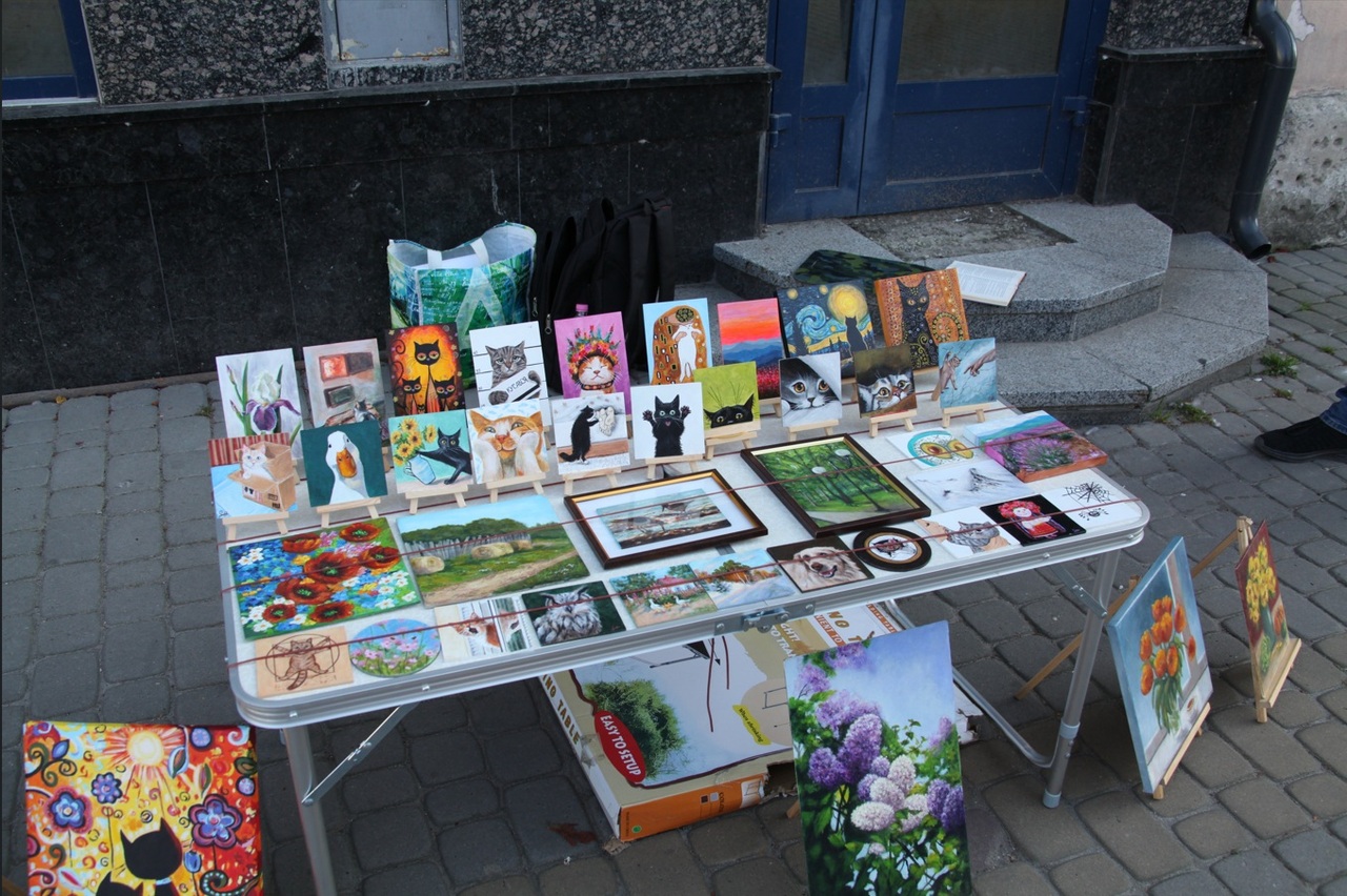 Олена Шаруда разом зі своїм чоловіком продають картини на вул. Валовій у Тернополі. Мисткиня каже: якщо її роботи дарують людям тепло, посмішку чи нагадують про щось хороше, значить вона малює недаремно