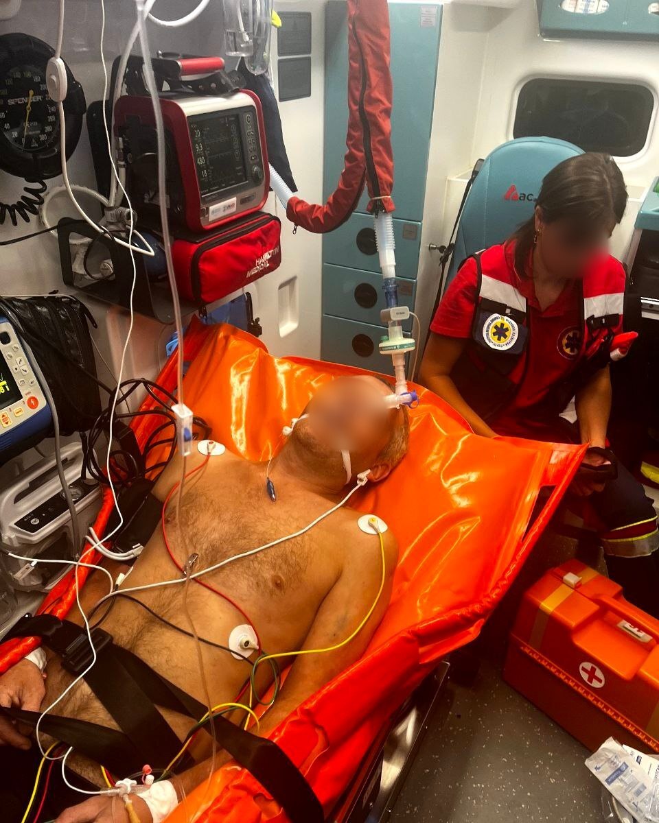 Перед транспортуванням стан чоловіка був критичним: свідомість 6 балів за ШКГ, ознаки набряку мозку та гіпертензія. Для стабілізації життєво важливих функцій медики виконали інтубацію трахеї, пацієнта підключили до апарата ШВЛ, провели знеболення, седацію та міорелаксацію. Постійно контролювали життєві показники.