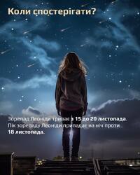 Найефектнішим зорепад буде пізно ввечері 17 листопада і спостерігати за ним можна буде аж до світанку 18 листопада. Місячне сяйво у цю ніч буде дуже незначним, тому українці зможуть сповна насолодитись метеорним потоком. Експерти зазначають, що можна буде побачити від 10 до 15 метеорів на годину.