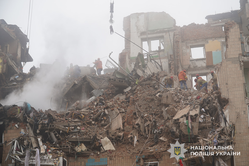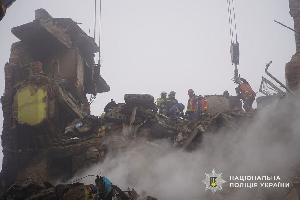 Поліцейські цілодобово працюють на місці російського терористичного удару, який зруйнував два житлові будинки й залишив десятки людей без даху над головою у Тернополі. Про це повідомили у відділі комунікації поліції області.