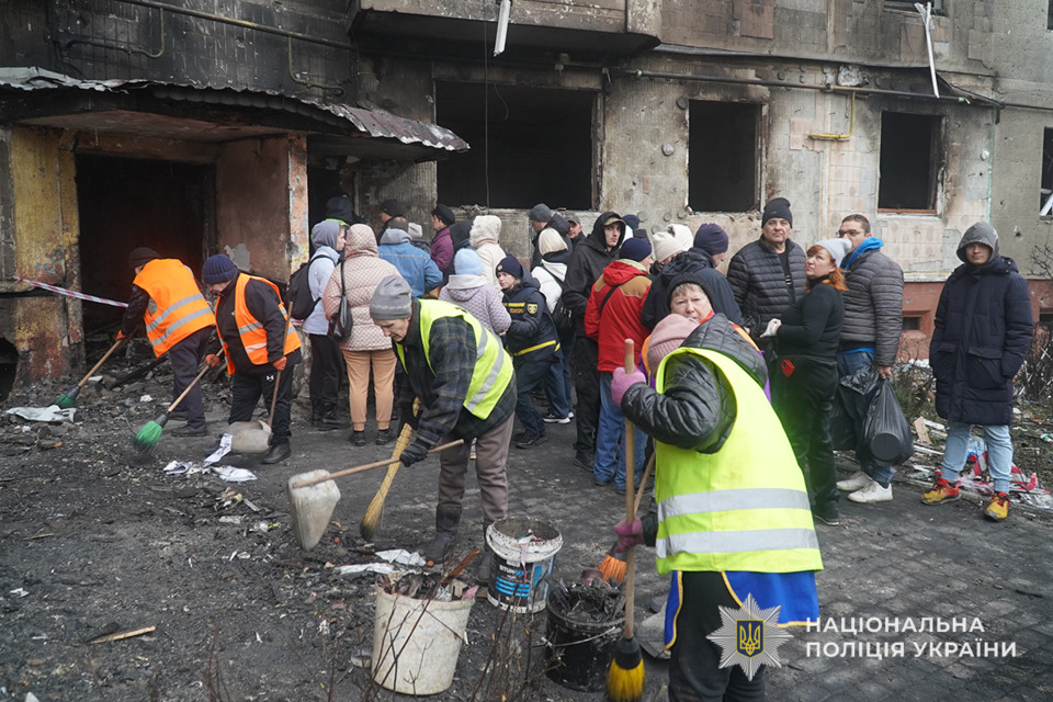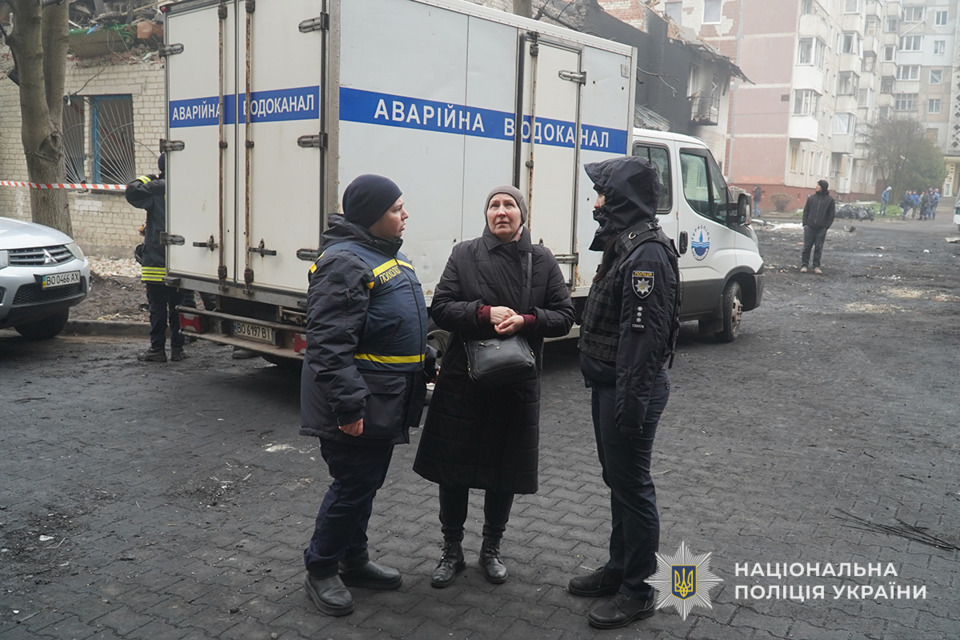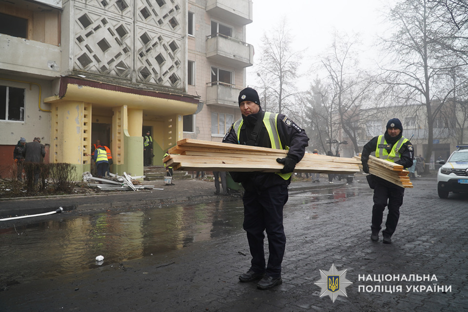 Поліцейські на даній локації забезпечують охорону громадського порядку, забезпечують охорону пошкодженого майна громадян від мародерства, а також допомагають людям, чим можуть. Для прикладу, проводять людей, які хочуть забрати свої речі з під'їздів, допомагають людям підносити будматеріали, забирати речі з квартир, надають консультації, куди люди можуть звернутися у разі написання заяв по пошкодження майна, щодо відновлення документів, які були втрачені під час обстрілу, а також по інших питаннях, з якими до нас звертаються громадяни, - розповідає начальник управління превентивної діяльності ГУНП в Тернопільській області Іван Рибчак.