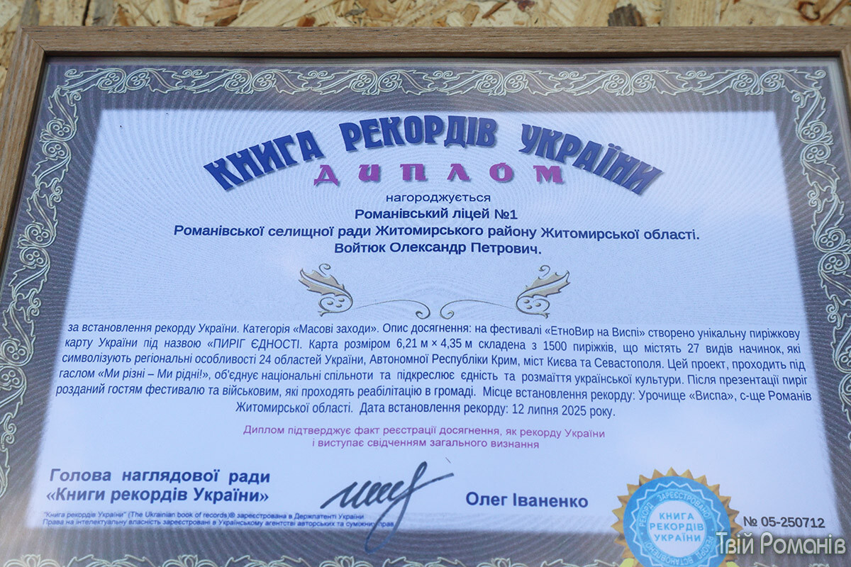 Фестиваль «ЕтноВир на Виспі» провели в селищі Романів на Житомирщині. Головною подією фестивалю стало встановлення національного рекорду — створення «Пирога Єдності» у формі карти України, викладеної з пиріжків. Про це пише Твій Романів.