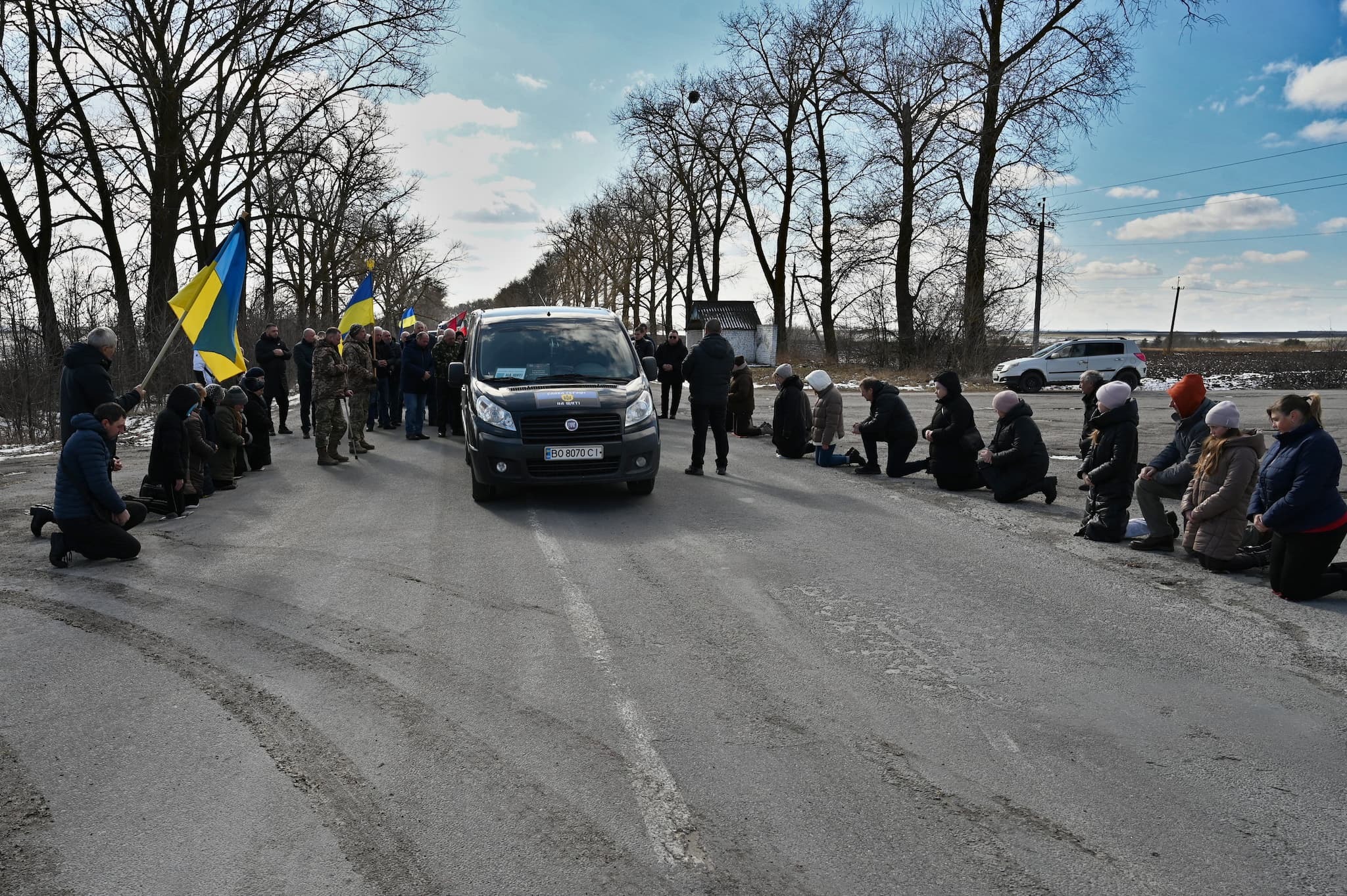 Скорботно зустріло кортеж рідне село Москалівка. Односельці стояли на колінах вздовж дороги, виказуючи свою шану полеглому земляку.
