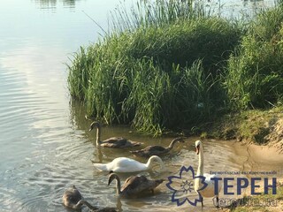 Сімейство з двох дорослих лебедів та чотирьох їхніх пташенят наполегливо відстоює власну територію. Своєю домівкою ці красиві птахи обрали стави у селах Малі та Великі Бережці.