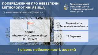 На території Тернопільської області 15 березня вдень прогнозують посилення вітру. За даними синоптиків, місцями очікуються пориви південно-східного вітру швидкістю 15–20 м/с. Про це повідомив Тернопільський обласний центр з гідрометеорології.