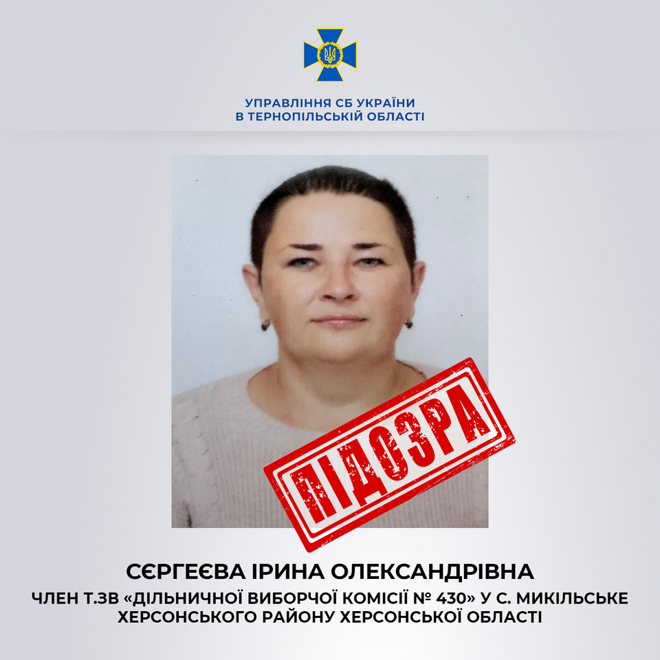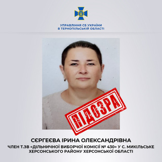 За матеріалами слідчих Тернопільського управління СБУ підозру у колабораційній діяльності отримала 41-річна жителька с. Микільське Херсонського району, яка добровільно пристала на пропозицію російських загарбників стати членом так званої «дільничної виборчої комісії». Про це повідомили у пресслужбі СБУ.