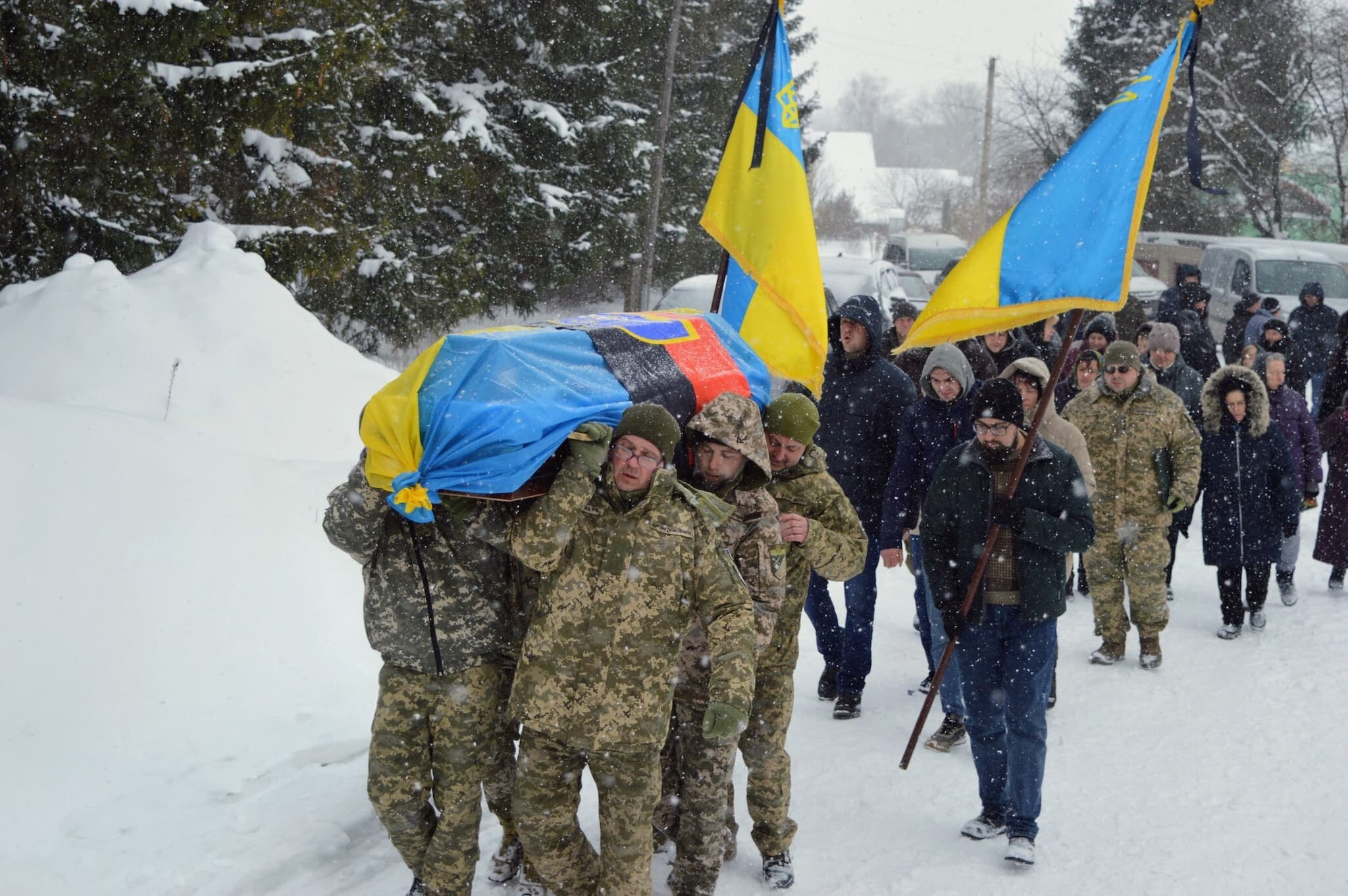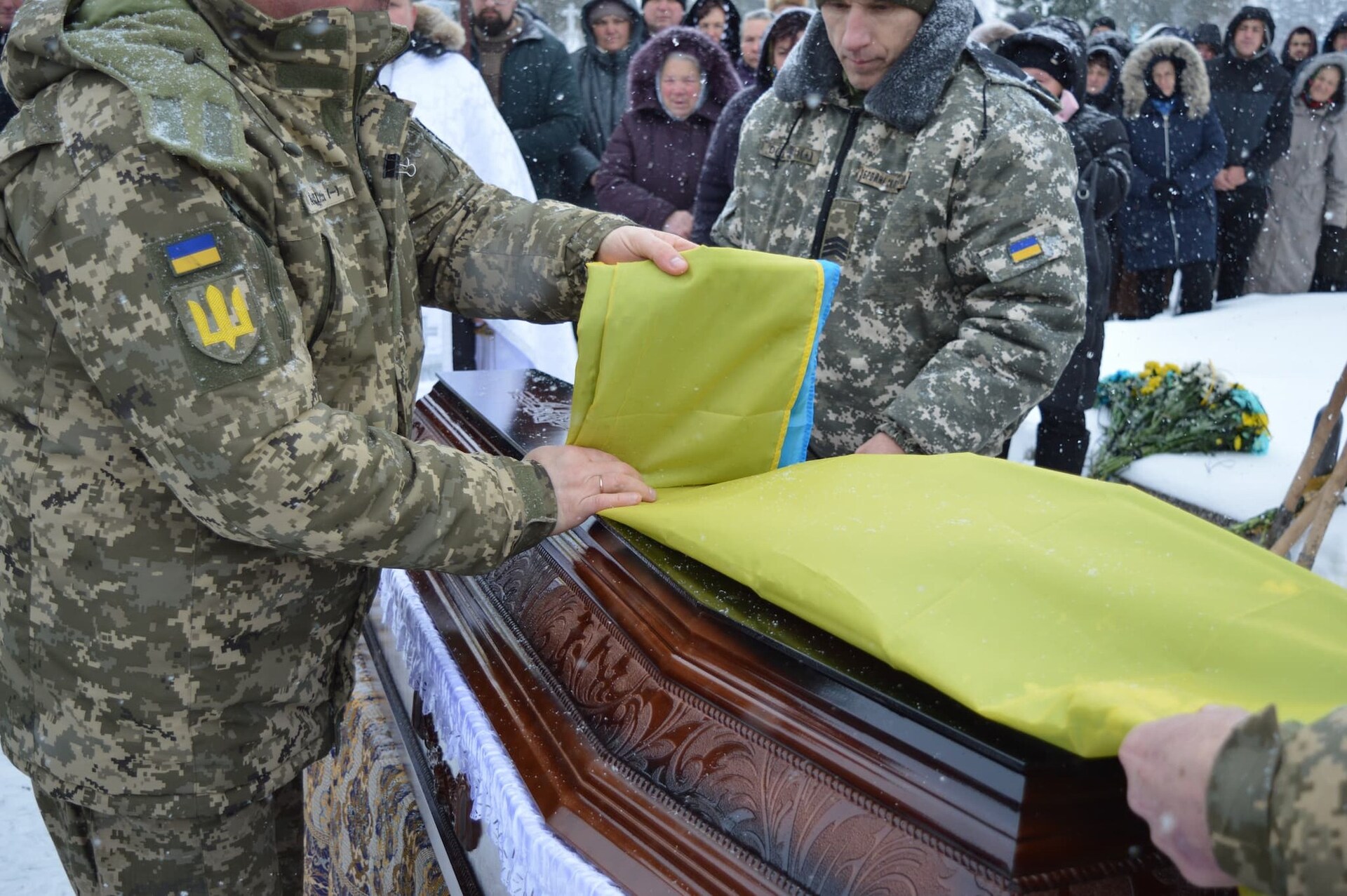 Прощання з воїном відбулося з усіма військовими почестями. Під звуки Державного гімну України та залпу дружині полеглого захисника вручили державний прапор.
