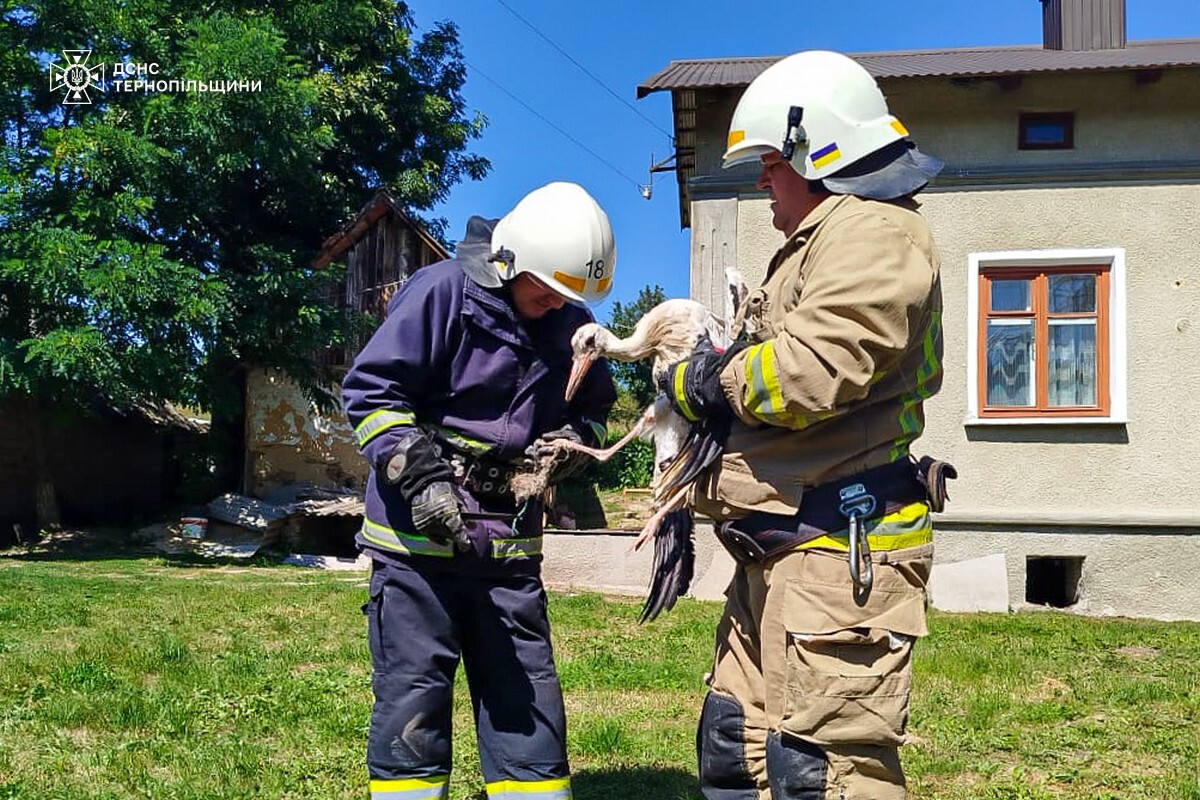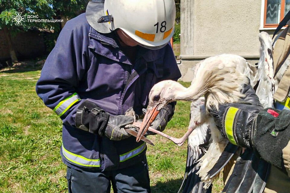 19 серпня до Служби порятунку Тернопільської області надійшло повідомлення про лелеку, який потрапив у біду. Птах заплутався в мотузці, що затягла його прямо у гнізді в селі Вибудів Козівської громади Тернопільського району, і не міг самостійно вибратися. Про це розповіли у пресслужбі ДСНС України.