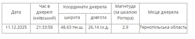 Землетрус магнітудою 2,9 бала за шкалою Ріхтера зафіксували в Мельнице-Подільській громаді 11 грудня. Про це повідомили на сайті Головного центру спеціального контролю.