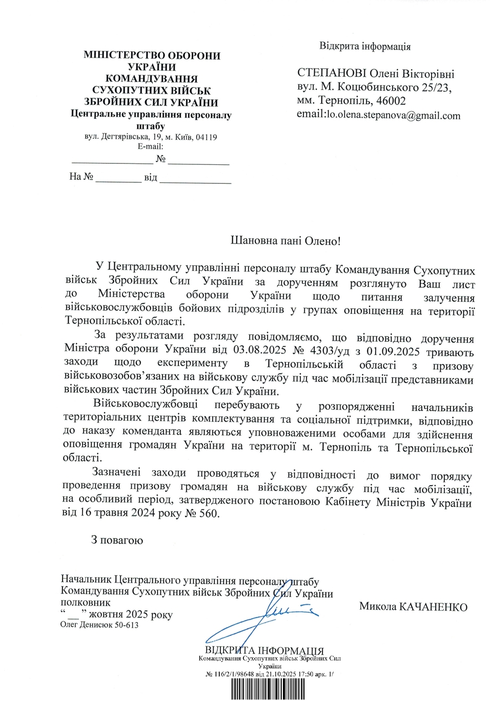 Військовослужбувці перебувають у розпорядженні начальників територіальних центрів комплектування і відповідно до наказу коменданта є уповноваженими особами для оповіщення громадян на території Тернополя та області, зазначають у листі (див. документ нижче).