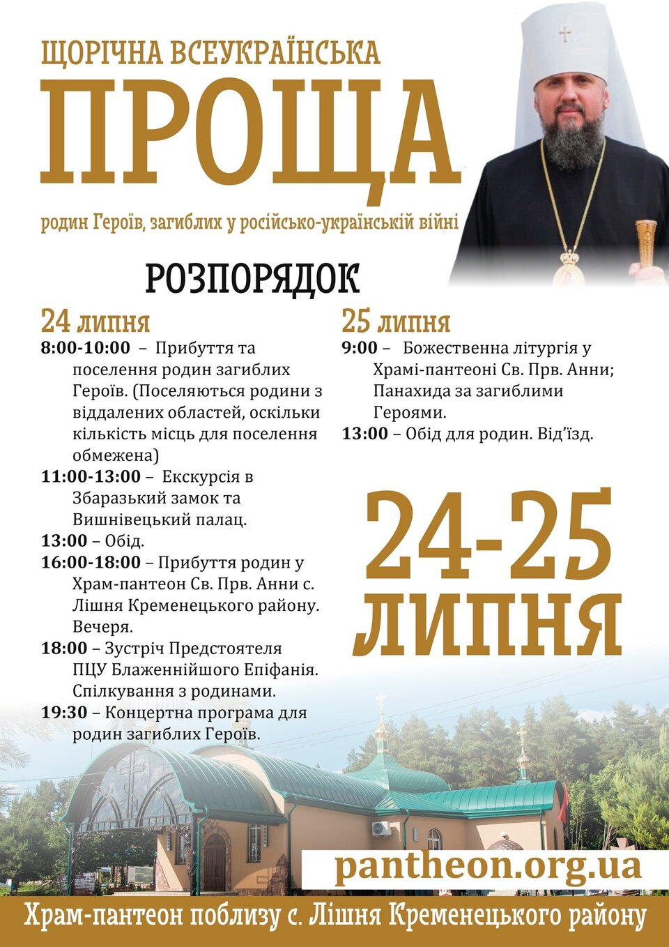 У день завершення прощі, 25 липня, о 9:00 Божественну літургію очолить Блаженніший митрополит Епіфаній, предстоятель Православної Церкви України. Священнослужителі запрошують до участі усіх, хто бажає в молитві вшанувати жертву полеглих.