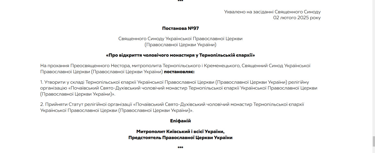 На прохання Преосвященного Нестора, митрополита Тернопільського і Кременецького, Священний Синод постановляє: утворити у складі Тернопільської єпархії релігійну організацію "Почаївський Свято-Духівський чоловічий монастир, - йдеться у постанові.