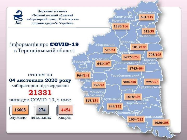 На Тернопільщині зменшилась кількість хворих на COVID-19 за попередню добу. Так, станом на 4 листопада підтвердили 146 нових випадків зараження, видужало 362 особи. Загалом провели 1229 досліджень методом ПЛР.