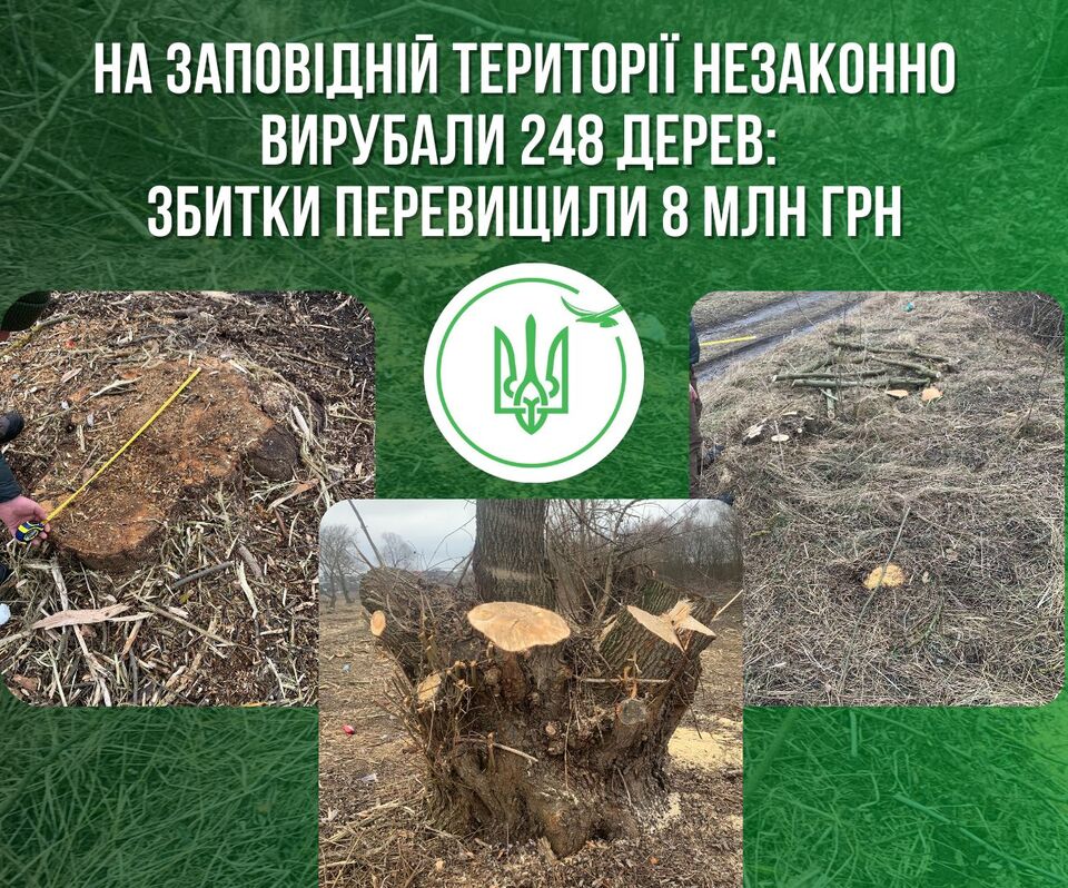 Загальний розмір шкоди, заподіяної порушенням законодавства про природно-заповідний фонд внаслідок незаконної рубки дерев, становить 8 253 846 гривень.