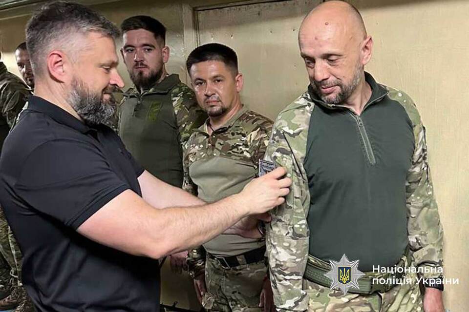 Начальник ГУНП в Тернопільській області Сергій Зюбаненко урочисто вручив бійцям стрілецького батальйону бойові шеврони, на яких зображено герб Тернополя та стрілу, що символізує рішучість, точність і відвагу у боротьбі за свободу та незалежність України.